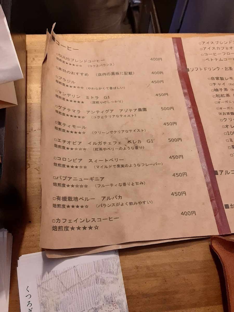 At Suus, each cup is a masterpiece. Their menu boasts a selection of specialty beverages, including the highly recommended Suus Blend Coffee and today's recommended coffee, both priced at just JP¥400. For those looking to try something different, the Ethiopian Yirgacheffe G1 is a delightful option at JP¥500, bringing vibrant flavors to your palate. And if you're in the mood for a refreshing treat, don’t miss the deliciously pure 100% Apple Juice for JP¥450. Each drink is carefully crafted to ensure a memorable tasting experience.